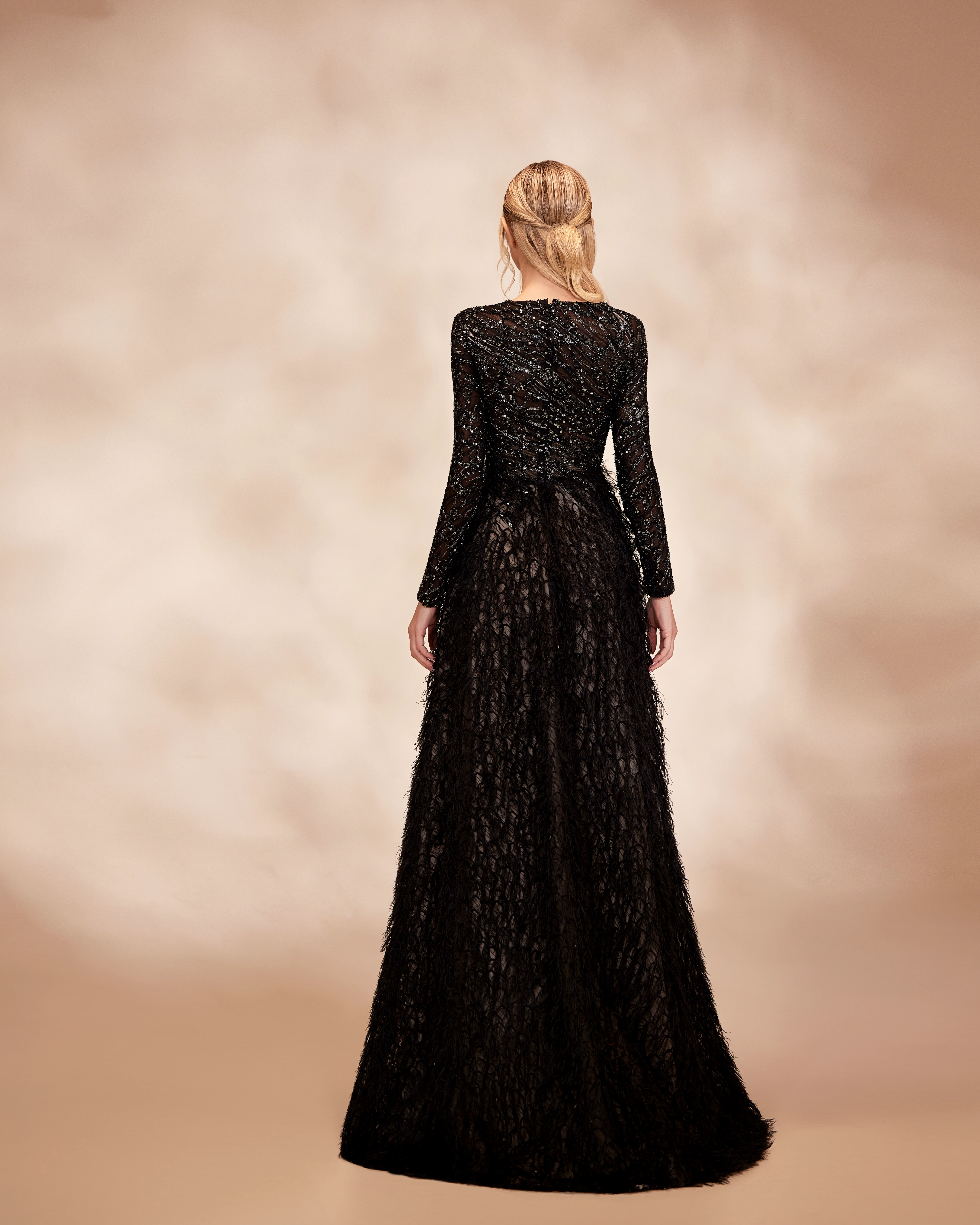 SS279- champagne-beige dress with long-sleeved bodice embellished